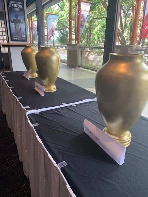 Voting urns. Links to the Dionysian Festival in Ancient Greece where plays are pitted against one another and the audience vote.